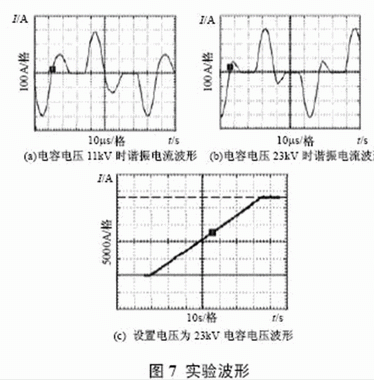 根據(jù)上面所設(shè)計(jì)的諧振參數(shù)進(jìn)行了實(shí)驗(yàn),實(shí)驗(yàn)波形如圖7 所示??梢钥闯?,為保持充電電流恒定,隨著輸出電壓的升高,開關(guān)頻率變高,實(shí)測(cè)充電電壓為23kV 時(shí)變換器效率為92.7%。實(shí)驗(yàn)表明,所設(shè)計(jì)的諧振參數(shù)完全滿足設(shè)計(jì)要求,該裝置已用于神光III 能源系統(tǒng)。