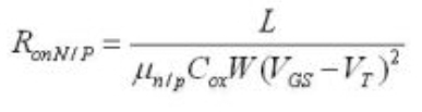 低導(dǎo)通電阻是模擬開關(guān)在音頻切換用途時(shí)的主要選擇因素。值得注意的是,導(dǎo)通電阻是針對(duì)具體的VCC 、VIN(電壓輸入)及給定負(fù)載電流而定義的。在晶體管級(jí),RON為起始長度(L)、寬度(W)、電子與空穴遷移率、氧化層電容、門限電壓及信號(hào)電壓的函數(shù)。如下所示: