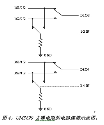 在音頻電路中,當(dāng)模擬開關(guān)斷開時(shí),由于寄生電容和電容失配,電容上的電荷無法釋放,從而導(dǎo)致耳機(jī)上的噪聲??梢酝ㄟ^在開關(guān)斷開時(shí)接通一個(gè)去噪電阻,來快速釋放電荷,從而提高音頻切換質(zhì)量。圖4是英聯(lián)電子的UM3699在開關(guān)切換時(shí)去噪電阻的連接示意圖。