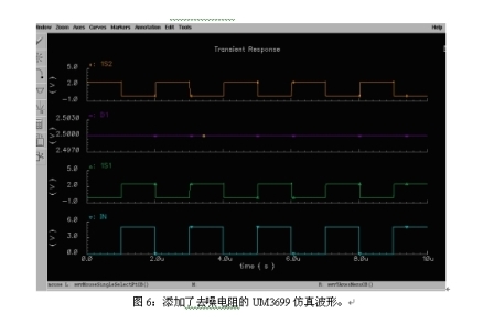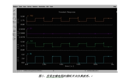 圖5是沒有采用去噪聲電阻時(shí)模擬開關(guān)的仿真波形圖。D1為輸入的數(shù)據(jù)信號(hào)。IN為選擇端信號(hào)。當(dāng)IN為高電平時(shí),開關(guān)通向1S1;當(dāng)IN為低電平時(shí),開關(guān)通向1S2。當(dāng)開關(guān)斷開時(shí),由于寄生電容和選擇端切換脈沖的存在,開關(guān)到地之間是高阻態(tài),所以寄生電容的電荷沒有放電回路。這樣,開關(guān)的關(guān)斷端在較長的時(shí)間內(nèi)將出現(xiàn)一個(gè)比輸入數(shù)據(jù)信號(hào)更高的電平,從而導(dǎo)致噪聲。圖6是采用圖4中的去噪電阻后開關(guān)切換的仿真波形圖。由于開關(guān)斷開后連接了去噪電阻上,形成一個(gè)對(duì)地的放電回路,所以寄生電容上的電荷得以很快釋放,從而消除了開關(guān)切換時(shí)的干擾電平,提高了開關(guān)在音頻切換應(yīng)用時(shí)的聲音質(zhì)量。