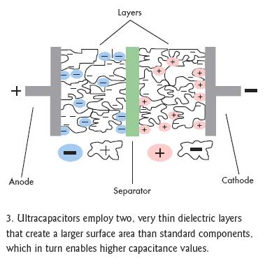 雙電層電容器(EDLC)正如它的字面意義那樣可以解決上述問題,它在相同的封裝內(nèi)增加了第二個電介層,這個電介層與第一層在中間隔離物的兩邊并行工作(圖3)。EDLC也采用無孔電介質(zhì),如活性碳、碳納米管、炭黑凝膠,并選用導(dǎo)電聚合物,其存儲容量要比標(biāo)準(zhǔn)的電解材料高出許多。額外層和更高效電介材料的這種組合能使電容容量提高近4個數(shù)量級。