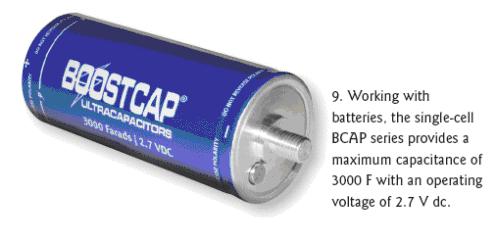 MaxwellTechnologies公司還有許多大型的具有很高容量的BOOSTCAP品牌單節(jié)電容器,不過工作電壓比較低。BCAP系列共5節(jié),在2.7Vdc的工作電壓下電容值可達650、1200、11500、2000和3000F(圖9)。這些電容的主要用途是與電池并行工作,適合要求恒定低功率放電以及峰值負(fù)載下提供脈沖功率的應(yīng)用。