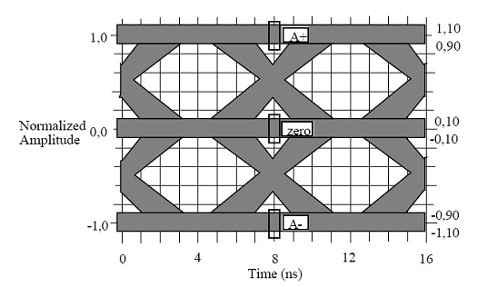 本次測試將主要驗(yàn)證產(chǎn)品上4個(gè)以太網(wǎng)100Base-TX接口的技術(shù)指標(biāo)。對于其中比較直觀的100Base-TX物理層的眼圖模板,《ANSI+X3_263-1995》標(biāo)準(zhǔn)中有著明確的眼圖模板定義見圖2。