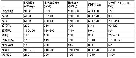 注:NA-數(shù)據(jù)不詳、a-C/3放電率、b-80%DOD、c-機械重充電、d-僅供參考、USABC-美國先進(jìn)蓄電池協(xié)作體。