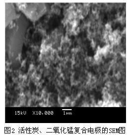圖2是活性炭/二氧化錳復合電極的SEM圖。從圖中可以看出,電極具有疏松的表面孔結(jié)構(gòu),這種特有的結(jié)構(gòu)可以為在電極表面發(fā)生的雙電層反應(yīng)和法拉第贗電容反應(yīng)提供良好的環(huán)境。