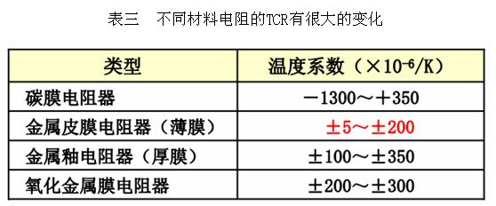 目前TCR小的電阻器只有薄膜電阻,一般情況下,碳膜與陶瓷電阻器TCR為負(fù),對于低TCR設(shè)計,首選推薦10ppm。不同材料電阻的TCR有很大的變化,大致范圍可以從下表看出:
