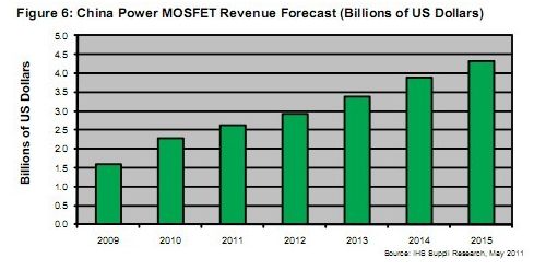 據(jù)IHS iSuppli公司的研究,2010年中國功率MOSFET市場快速增長,銷售額達到23億美元,比2009年的16億美元增長43%。