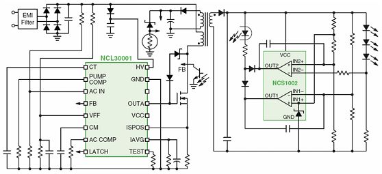 圖6 基于NCL30001 LED驅(qū)動(dòng)器和NCS1002控制器的90 W LED驅(qū)動(dòng)器演示板電路