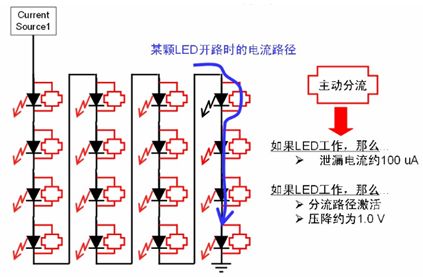 區(qū)域照明應(yīng)用中通常會(huì)采用多串LED,雖然LED本身可靠性高,但若LED串中的某個(gè)LED開路,那么整串LED就可能關(guān)閉,而街道照明等應(yīng)用中必須避免這種狀況,從而降低后期維護(hù)成本。為了增強(qiáng)LED串的可靠性,這種安森美半導(dǎo)體推出了NUD4700 LED電流旁路保護(hù)器。NUD4700器件是一款分流器件,當(dāng)LED串中某個(gè)LED開路時(shí),就會(huì)提供電流旁路,確保整串LED不會(huì)關(guān)閉;而且恰當(dāng)處理散熱的話,還可支持大于1 A的大電流,其工作原理如圖8所示。