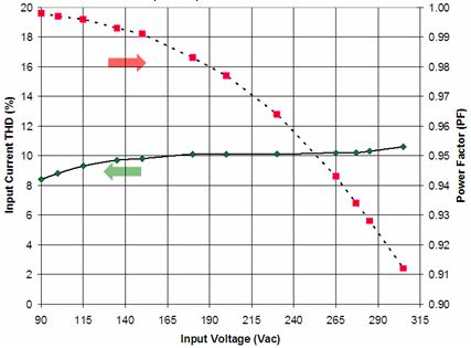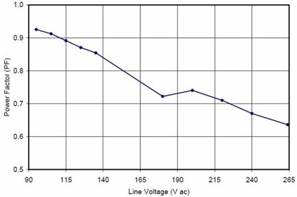 在針對商業(yè)照明的應(yīng)用中使用的是寬動態(tài)范圍的精確導(dǎo)通時間控制器方案NCL30000。設(shè)計中采用控制器(外置FET等旁路元件)方案的原因包括易于在能效和成本之間實現(xiàn)折衷、能以單顆控制器支持寬功率范圍(5到30 W)、及便于優(yōu)化散熱及靈活布線等。基于NCL30000構(gòu)建的90到305 Vac EFD25演示板(Vout = 12 LED, 37 Vdc)測試顯示,功率因數(shù)遠(yuǎn)高于0.9,部分輸入電壓條件下功率因數(shù)甚至高于0.95(見圖9),能效也極高。