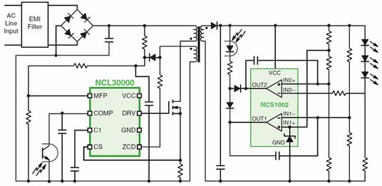 如前所述,為低功率LED照明應(yīng)用選擇適合的驅(qū)動器須考慮眾多因素,這其中,有關(guān)功率因數(shù)等行業(yè)標(biāo)準(zhǔn)尤為重要。接下來,我們將以安森美半導(dǎo)體的幾款低功率LED通用照明驅(qū)動方案為例,探討如何在低功率照明應(yīng)用中提供高功率因數(shù)。