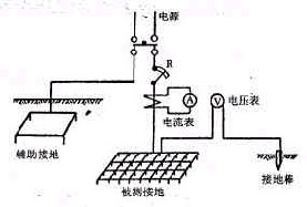 最初人們對接地電阻的測量是用伏、安法,這種試驗是非常原始的。圖1是用安培計、伏特計的測量方法。在測定電阻時須先估計電流的大小,選出適當截面的絕緣導線,在預備試驗時可利用可變電阻R調整電流,當正式測定時,則將可變電阻短路,由安培計和伏特計所得的數(shù)值可以算出接地電阻。
