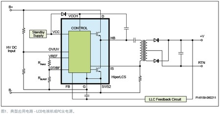在高壓電源轉(zhuǎn)換電路設(shè)計(jì)中,諸如電源噪聲、開關(guān)頻率、開關(guān)損耗、電源體積、可靠性等問(wèn)題一直是關(guān)鍵所在。與其它的高壓拓?fù)浣Y(jié)構(gòu)相比,LLC轉(zhuǎn)換器因效率高且設(shè)計(jì)的電源體積小,在高壓電源適用領(lǐng)域一直受到設(shè)計(jì)師的青睞,不過(guò)其設(shè)計(jì)難度也非常大。Power Integrations公司(PI)不久推出的HiperLCS系列LCS700-708高壓LLC電源IC,將變頻控制器、高壓端和低壓端驅(qū)動(dòng)器以及兩個(gè)MOSFET同時(shí)集成到了一個(gè)低成本封裝中,具有出色的設(shè)計(jì)靈活性,其最高負(fù)載效率超過(guò)97%,并利用高頻開關(guān)來(lái)減小變壓器的尺寸和輸出電容的占板面積,由此達(dá)到縮小電源尺寸的目的。圖1所示為HiperLCS功率級(jí)的電路簡(jiǎn)圖,其中LLC諧振電感集成在變壓器中。變頻控制器通過(guò)零電壓(ZVS)開關(guān)功率MOSFET,消除開關(guān)損耗,從而達(dá)到高效率。