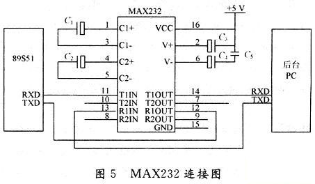 為了滿足數(shù)據(jù)傳輸距離大于200m,通信采用75LBC180全雙工485芯片,單片機通信電平和計算機電平的轉換采用MAX232完成,如圖5所示。MAX232芯片是專為電腦的RS232標準串口設計的接口電路,使用+5V單電源供電。另外。RS232到RS485的轉換可采用專用的轉換器,如BOK-60或ATC-160A無源轉換器。
