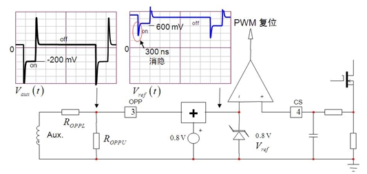 如圖 1 所示,電路中的光耦合器斷路或 TL431 分壓器網(wǎng)絡(luò)遭受?chē)?yán)重漂移影響(或其某個(gè)電阻丟失或出現(xiàn)錯(cuò)誤值)時(shí),輸出電壓就可能超出規(guī)定的限制值,這就是過(guò)壓條件。大多數(shù)情況下,過(guò)壓條件可能對(duì)下行負(fù)載有害,適配器這時(shí)必須完全關(guān)斷。NCP1250/1 在 OPP 引腳上也集成了 3 V 參考比較器,這比較器可用于多種功能,如 OVP。如果這 OPP 引腳電壓連續(xù)四次超過(guò) 3 V,就使控制器 IC 閂鎖保護(hù)。