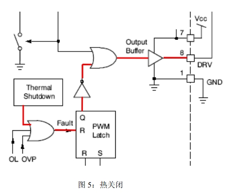 熱關閉(TSD):過熱保護功能有助于實現(xiàn)良好的電源設計。當結點溫度超過140℃時,該功能激活,驅動器變?yōu)榈碗娖?;結點溫度降到典型值30℃時器件恢復工作。