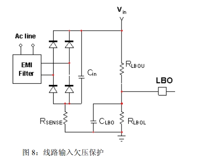 1.線路輸入欠壓(BO)保護:線路輸入欠壓引腳接收部分平均輸入電流,因此,感測到低線路電壓時,50ms定時器就會激活。這段消隱時間用于幫助符合維持要求。如果線路電壓在50ms消隱延遲結束時仍處于低電平,輸入欠壓保護就被觸發(fā),PFC驅動器關閉,VCTRL引腳接地,可使器件在故障消失時使用軟啟動。
