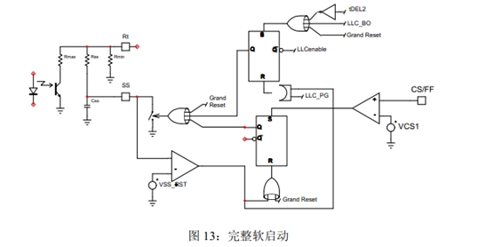 •在軟啟動或重啟時,專用引腳將SS電容放電至地,從而提供平順的輸出電壓上升;在LLC被CS/FF引腳(>1V)或BO功能關閉時,SS引腳給CSS放電,并提供純粹的軟啟動;