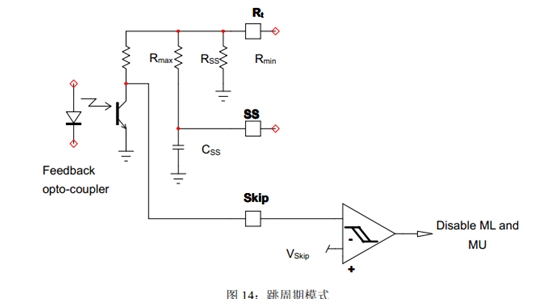 在下列情況時,VLBO可下拉至2V(VLBO(PD)):VLBO高于2V(高線路電壓時),以及VCTRL處于最大值的時間長于4ms(tPFCflag);Vbulk低于額定輸出的95%時。PFCPowerBoost功能在啟動時被禁止;最長下拉持續(xù)時間的典型值為5ms(tLBO(PDlimit));在后續(xù)最少70ms時間(tLBO(PDblank))內(nèi),開關保持在開路狀態(tài)。