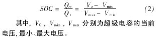 如果僅采用超級(jí)電容作為唯一輔助能源還存在諸多不足之處,如:電動(dòng)汽車長(zhǎng)時(shí)間停機(jī)后再次啟動(dòng),由于超級(jí)電容的自放電效應(yīng),在燃料電池的能量輸出尚未穩(wěn)定時(shí)車載輔助系統(tǒng)的供電將無法保障。況且超級(jí)電容能量密度很低,若要達(dá)到一定的能量?jī)?chǔ)備能力其設(shè)備體積勢(shì)必加大。當(dāng)前超級(jí)電容都是與其他動(dòng)力電池一起購車輔助電源系統(tǒng),在燃料電池汽車上使用的。為了克服精確的描述超級(jí)電容的特性,可以采用阻抗法進(jìn)行建模代替簡(jiǎn)單RC回路模型。超級(jí)電容當(dāng)前SOC主要基于超級(jí)電容的輸出電壓:
