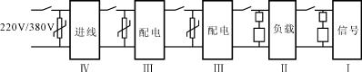 從圖1可以看出,在220V/380V線路中的每一區(qū)域,都應該在其前面并聯(lián)氧化鋅壓敏電阻器或過電壓保護器,雷電感應過電壓能量將通過逐級的防雷器件吸收和釋放到大地中,達到保護線路和設備免受雷電破壞的目的;雖然應用于Ⅳ、Ⅲ區(qū)域的過電壓保護器具有自身劣化斷開電源的功能,但考慮到不同的接地狀況,還應與過電壓保護器串聯(lián)合適的熔斷器或空氣開關.