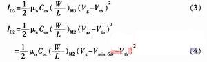 接下來(lái)將分析VM2、VM3和VM4組成的網(wǎng)絡(luò)如何確保Vmin_OD大于0。分析電路可知,VM2、VM3工作在飽和區(qū),VM4工作在線性區(qū),因此ID3>ID4,ID4=ID2。