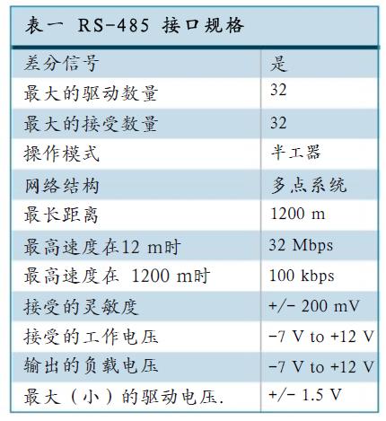表一詳細(xì)的說(shuō)明了RS-485 接口的規(guī)范。主要的參數(shù)包括-7V 到+12V 的工作電壓,32Mbps 的數(shù)據(jù)傳輸速度已經(jīng)1200 米的傳輸距離等。一個(gè)完全兼容的RS-485 接口必須符合 IEC61000-4-2(靜電),IEC61000-4-4(群脈沖)和 IEC61000-4-5 (浪涌)標(biāo)準(zhǔn)。