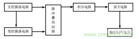 HS1101在電路中相當(dāng)于一個(gè)電容器件,它的電容量隨著所測(cè)空氣濕度的增加而增大,為了能將電容的變化轉(zhuǎn)換成電壓的變化,我們?cè)O(shè)計(jì)了振蕩電路、消除零點(diǎn)電容影響電路、整流電路、積分電路、電壓—電流轉(zhuǎn)換電路、放大電路等,其工作原理簡(jiǎn)圖如圖2 所示。