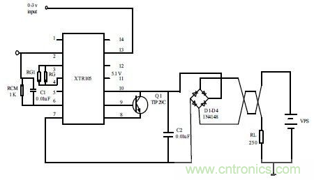 輸出的0~3V 電壓通過XTR105 芯片的2 和13 引腳輸入。調(diào)整3 和4 引腳間的電阻RG和RG1 的值,可以改變XTR105 芯片的內(nèi)置儀表放大器增益值,從而選定合適的測(cè)量范圍。RCM 取為1KO,它提供一個(gè)附加電壓降,使XTR105 的輸入電壓限制在共模方式下的電壓范圍內(nèi)。與RCM 并聯(lián)的0.01μF 旁路電容用于降低共模噪聲。