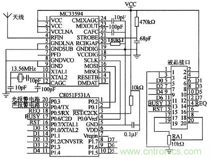 主控制器電路原理如圖3所示。主控制器模塊采用穩(wěn)定、可靠的微控制器C8051F531A,其內(nèi)置振蕩電路和增強(qiáng)型的SPI接口,外擴(kuò)SPI無線接收芯片MC33594和操作簡(jiǎn)單、方便的并行液晶模塊。