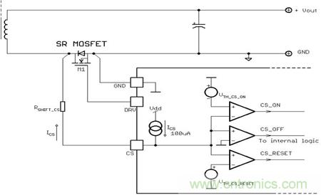 CS_OFF比較器是非常精密的真正的零比較器,通過同步整流將系統(tǒng)能效提升至最高。NCP4305的CS腳和SR MOSFET(M1) 之間的電阻用來調(diào)節(jié)關(guān)斷電流。當CS腳電壓低于VTH_CS _ON閾值時,M1 導(dǎo)通;當CS腳電壓高于VTH_CS _OFF閾值時,M1關(guān)斷。