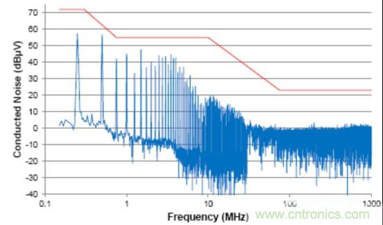 由于信號(hào)的共模部分能夠與系統(tǒng)(或與外部系統(tǒng))中的其它分量耦合在一起(通過輻射或傳導(dǎo)路徑),這個(gè)共模噪聲直接影響放射性能。這個(gè)器件的傳導(dǎo)放射按照工業(yè)電氣工程/電子 (IBEE) 茨維考技術(shù)的工程服務(wù)進(jìn)行測(cè)量;如圖2中所示,這個(gè)器件的傳導(dǎo)放射連同一個(gè)普通汽車原始設(shè)備制造商(OEM)限值線一同繪制。