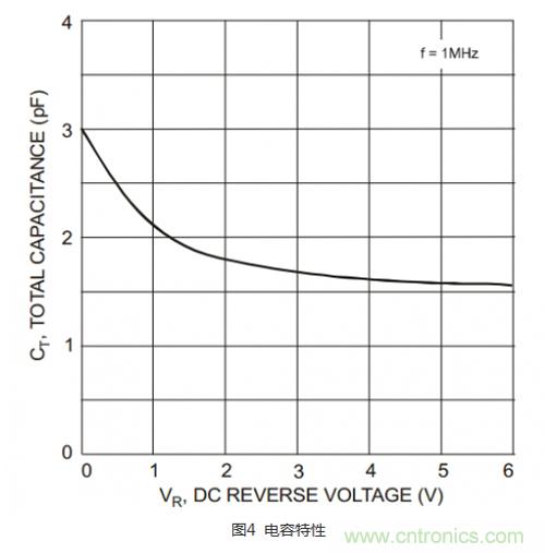 首先,我們熟悉下二極管的電容特性:圖4所示的是IN4448HWS二極管的電容特性。零反向偏壓下,電容是3pF,隨著反向偏壓越來(lái)越大,結(jié)電容越來(lái)越小。
