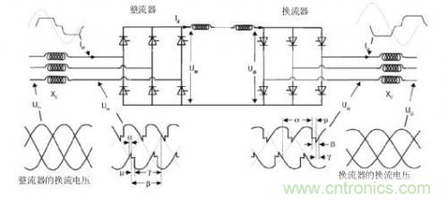 LCC有兩種典型的架構(gòu):6脈沖橋和12脈沖橋。圖2所示為6脈沖橋,其使用六個晶閘管閥:每個相位使用兩個閥來傳導正負電壓波形。LCC的諧波響應能力非常差。為了彌補這一點,通過將兩個6脈沖橋串聯(lián)形成12脈沖橋則可以改善諧波。