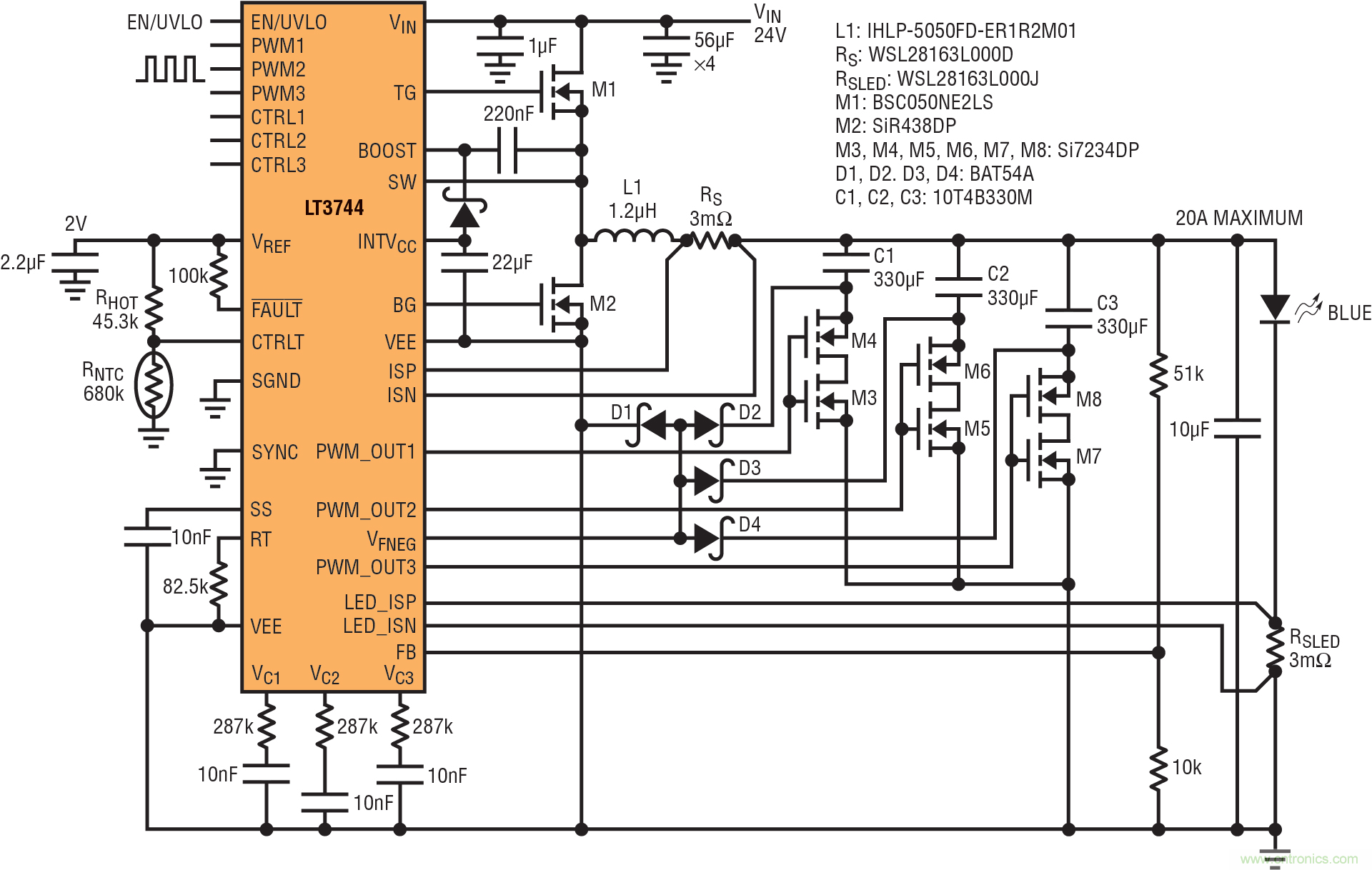 一個(gè)具備新式功率 MOSFET 的高效率大電流 LED 驅(qū)動(dòng)器控制器可以提供大約 200W (解決方案尺寸大約為 4cm2),并可將所有電源通路組件的溫度限制到低于 80ºC。就高于 200W 的 LED 負(fù)載而言,LT3744 可以并聯(lián),以限制任何組件的溫度上升。所有補(bǔ)償輸出都應(yīng)該并聯(lián),以允許轉(zhuǎn)換器之間的均流。
