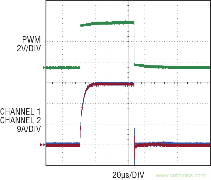 圖 12:在進(jìn)行 PWM 調(diào)光時(shí),LT3744 的并聯(lián)驅(qū)動(dòng)器之間實(shí)現(xiàn)了出色的 LED 電流均分。