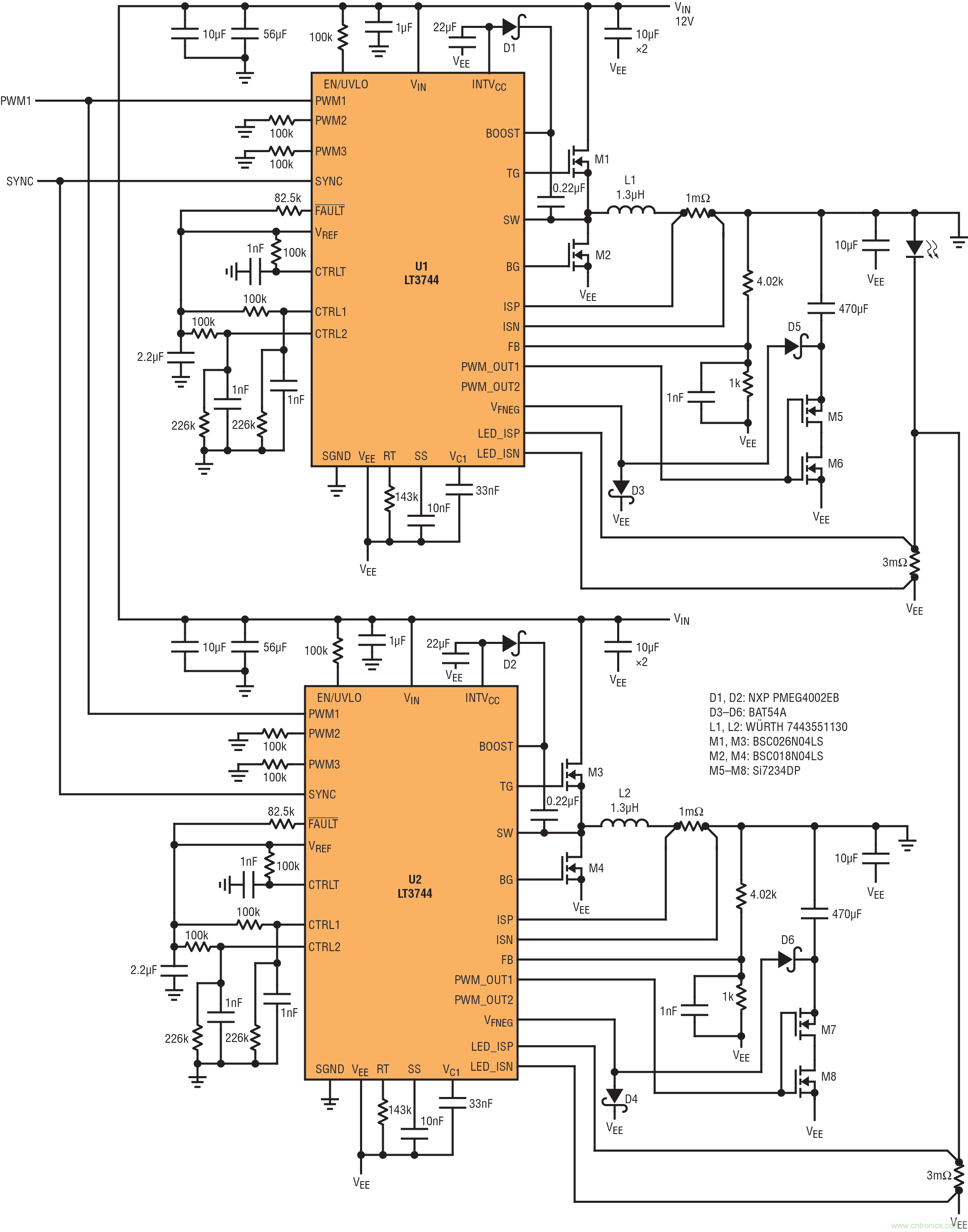 兩個(gè) LT3744 LED 驅(qū)動(dòng)器并聯(lián)以組成 324W 雙 LED 驅(qū)動(dòng)器