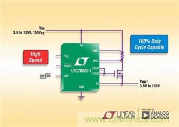 LTC7000是一款快速、高壓側(cè) N 溝道 MOSFET 柵極驅(qū)動器,主要接收一個參考于地的低電壓數(shù)字輸入信號,并以 35ns 的傳播延遲完全接通或關(guān)斷一個其漏極可高出地電位達(dá) 135V 的高壓側(cè) N 溝道 MOSFET。13ns的快速上升和下降時間 (當(dāng)驅(qū)動一個 1000pF 負(fù)載) 最大限度降低了