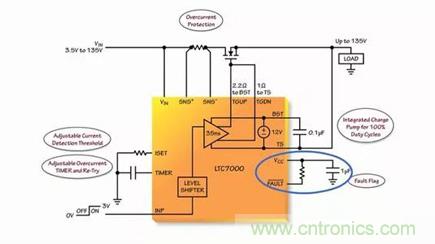 它還有著強(qiáng)大1Ω 柵極驅(qū)動器,能夠以非常短的轉(zhuǎn)換時間驅(qū)動大柵極電容 MOSFET,這種過流跳變功能非常適合高頻開關(guān)和靜態(tài)開關(guān)應(yīng)用。加上故障標(biāo)記、欠壓閉鎖和過壓閉鎖等保護(hù)功能,可以發(fā)現(xiàn)它在工業(yè)和汽車市場中是非常有用的,例如靜態(tài)開關(guān)驅(qū)動器、負(fù)載和電源開關(guān)驅(qū)動器及繼電器替代產(chǎn)品。接下來我們就說說LTC7000的特點(diǎn)~