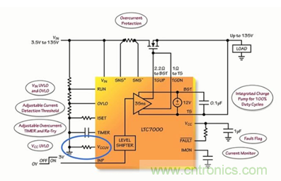 因?yàn)長TC7000 還具有一個 TIMER 引腳,因此過流情況不會立刻關(guān)斷外部 MOSFET。在 TIMER 引腳和地之間連接一個電容器,它用于設(shè)定在外部 MOSFET 在過流故障情況下被關(guān)斷之前的延遲周期,該關(guān)斷延遲周期可設(shè)定在最短 1.4µs (如果 TIMER 引腳開路) 到幾十或幾百 ms (如果電容器為µF 級) 的范圍內(nèi),布設(shè)在 TIMER 引腳上的同一個電容器還負(fù)責(zé)設(shè)定一個冷卻周期。