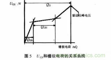 柵極電荷QG包含了兩個(gè)部分:柵極到源極電荷QGS;柵極到漏極電荷QGD—即“Miller”電荷。QGS是使柵極電壓從0升到門(mén)限值(約3V)所需電荷;QGD是漏極電壓下降時(shí)克服“Miller”效應(yīng)所需電荷,這存在于UGS曲線比較平坦的第二段(如圖5所示),此時(shí)柵極電壓不變、柵極電荷積聚而漏極電壓急聚下降,也就是在這時(shí)候需要驅(qū)動(dòng)尖峰電流限制,這由芯片內(nèi)部完成或外接電阻完成。實(shí)際的QG還可以略大,以減小等效RON,但是太大也無(wú)益,所以10V到12V的驅(qū)動(dòng)電壓是比較合理的。這還包含一個(gè)重要的事實(shí):需要一個(gè)高的尖峰電流以減小MOS管損耗和轉(zhuǎn)換時(shí)間。
