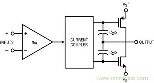 圖 1a 顯示了一個非軌至軌放大器的方框圖。輸入控制 gm 方框,gm 方框驅(qū)動增益節(jié)點(diǎn),并在輸出端得到緩沖。補(bǔ)償電容器 Cc 是主要的頻率響應(yīng)組件。Cc 的返回引腳應(yīng)該接地,如果有這樣一個引腳的話;但是運(yùn)算放大器傳統(tǒng)上不接地,電容器電流會返回一個或兩個電源。圖 1b 是最簡單的軌至軌輸出放大器的方框圖。輸入方框 gm 的輸出電流通過“電流耦合器”發(fā)送,這將驅(qū)動電流分成兩部分,提供給輸出晶體管。頻率響應(yīng)由兩個 Cc/2s 決定,二者實(shí)際上是并聯(lián)的。