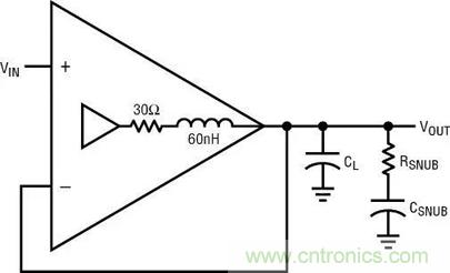 防止負(fù)載電容引起振蕩的最常見方式是,在反饋連接之后,簡單地給電容串聯(lián)一個小阻值的電阻器。10Ω 至 50Ω 的阻值將限制容性負(fù)載可能引起的相位滯后,并在速度非常高的時(shí)候,隔離放大器和低容性阻抗。缺點(diǎn)包括隨負(fù)載電阻特性而變化的 DC 和低頻誤差、容性負(fù)載頻率響應(yīng)受到限制、以及如果負(fù)載電容在電壓變化時(shí)不恒定所導(dǎo)致的信號失真。