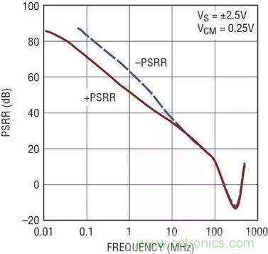 放大器的其余部分需要無噪聲電源,因?yàn)檫@些部分不能隨著頻率變化抑制電源噪聲。在圖 11 中我們可以看到 LTC6268 隨頻率變化的電源抑制比 (PSRR)。在所有運(yùn)算放大器中,因?yàn)闆]有接地引腳,所以補(bǔ)償電容器都連接到電源,會將電源噪聲耦合到放大器中,gm 必須抵消這種噪聲。由于補(bǔ)償,PSRR 隨著 1/f 降低,而且過了 130MHz 后,電源抑制實(shí)際上在變大。在 200MHz 時(shí),因?yàn)?PSRR 的增大,輸出電流可能干擾 LVs 電感器內(nèi)部的電源電壓,通過 PSRR 的放大,干擾變成很強(qiáng)的放大器信號,驅(qū)動輸出電流、產(chǎn)生內(nèi)部電源信號等,導(dǎo)致放大器振蕩。這就是所有放大器的電源都必須用電感很小的走線和組件精心旁路的原因。此外,電源旁路電容器必須比任何負(fù)載電容都大得多。