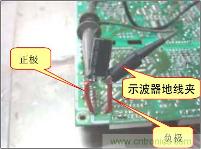 B. 方法(2):在電源板的錫面找出待測電容正負極對應的焊點,焊上兩根導線,然后用電壓探頭夾住引出的導線測試.如下圖: