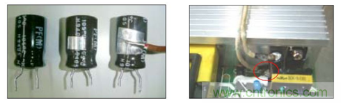 B.當電路板上電容所在的位置周圍有發(fā)熱器件(如功率管,散熱片等)時, 將溫度感應探測端接于電容靠近發(fā)熱源的側面鋁殼上,將對著發(fā)熱源的鋁殼表面膠管剝掉一小塊,用點溫膠直接粘連(或利用熱傳導率高的銀膠帶連接,用酒精等東西擦式表面后貼上銀色膠帶),溫度感應探測線另一端連接點溫機,如下圖: