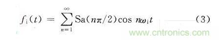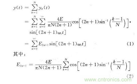 首先對量化過程進(jìn)行分析,現(xiàn)假設(shè)基帶輸入信號為一個(gè)正弦信號gi(t)=Esinωit,量化位數(shù)為N,經(jīng)過量化后的信號可用階梯波y(t)表示,y(t)可以被認(rèn)為是N對矩形波的疊加。如果A/D變換的量化位數(shù)為m,那么正或負(fù)半周的量化臺階數(shù)為N=2m-1。階梯波的表達(dá)式為: