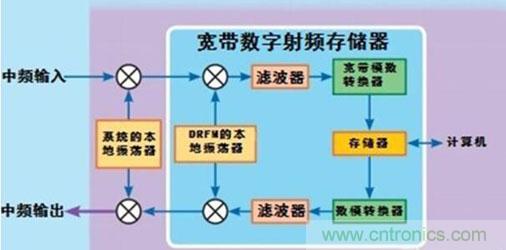 數(shù)字射頻存儲(DRFM)的基本工作原理:首先將輸入射頻信號下變頻為中頻信號,經(jīng)A/D變換后成為數(shù)字信號,寫入高速存儲器中。當(dāng)需要重發(fā)這一信號時(shí),在控制器控制下讀出此數(shù)字信號并由D/A變換為模擬信號。然后用同一本振作上變頻,得到射頻輸出信號,完成對輸人信號的存儲轉(zhuǎn)發(fā)。
