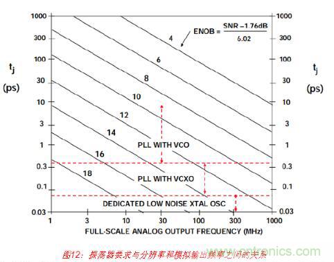 圖12顯示的是與圖10相同的數(shù)據(jù),但其中針對(duì)各種分辨率要求繪制出與模擬輸出頻率成 函數(shù)關(guān)系的最大允許抖動(dòng)。根據(jù)最大輸出頻率和ENOB中所需分辨率來(lái)選擇采樣時(shí)鐘發(fā)生 器類(lèi)型,應(yīng)以此圖片作為大概準(zhǔn)則。具有標(biāo)準(zhǔn)VCO的PLL方法就是產(chǎn)生采樣時(shí)鐘的一種 不錯(cuò)方式,其中均方根(RMS)抖動(dòng)要求大約為1 ps或以上。不過(guò),亞皮秒抖動(dòng)要求采用基 于VCXO的PLL或?qū)S玫驮肼暰w振蕩器。“教程MT-008”介紹了如何將振蕩器相位噪聲轉(zhuǎn) 換成抖動(dòng)。