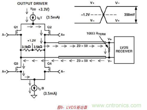 當(dāng)并行數(shù)據(jù)速率超過(guò)約100 MSPS時(shí),由于不太可能會(huì)產(chǎn)生CMOS邏輯電平以上的瞬變干 擾,因此通常使用低電平電流模式差分邏輯(PECL、較低級(jí)別的PECL或LVDS等)(見(jiàn)圖 9)。這樣可幫助最大程度地減少因碼相關(guān)毛刺而產(chǎn)生的失真。例如,AD9734/AD9735/ AD9736 DAC系列采用1.2 GSPS并接受LVDS輸入邏輯電平。片上包含特殊電路,以確保 輸入數(shù)據(jù)相對(duì)于DAC時(shí)鐘具有正確時(shí)序